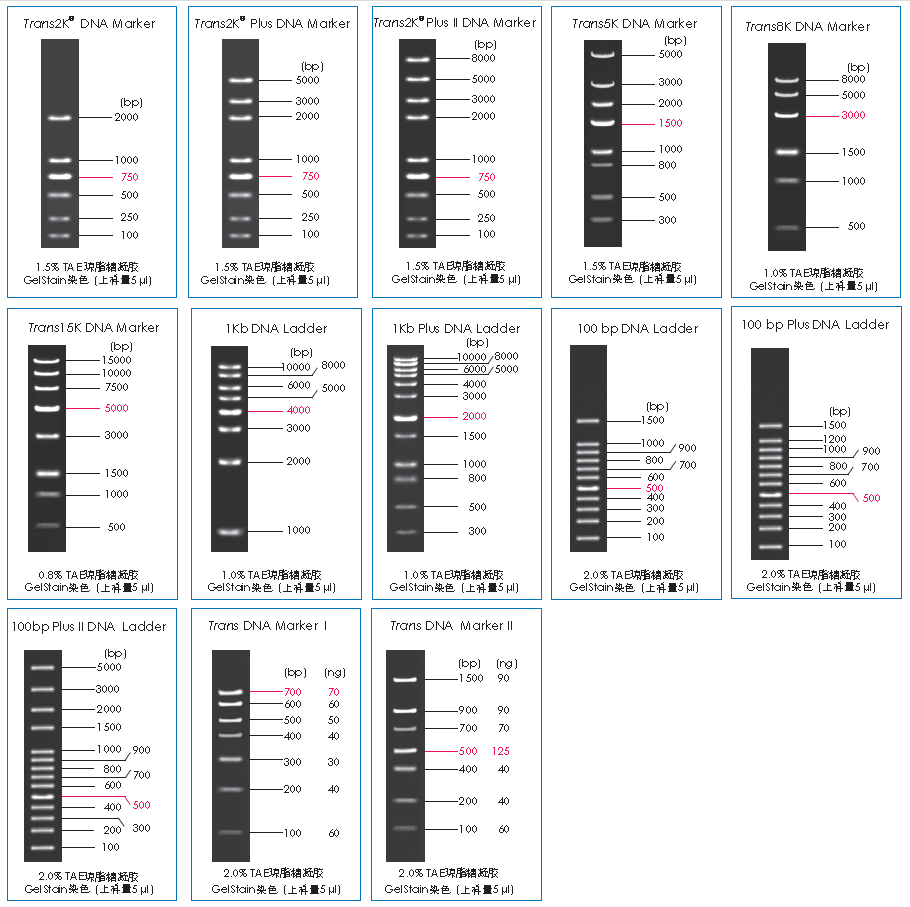 1 Kb DNA Ladder是由8條線狀雙鏈DNA條帶組成,適用于瓊脂糖凝膠電泳中DNA條帶的分析,不建議用于聚丙烯酰胺凝膠電泳。本產品為即用型產品,已含有1×Loading Buffer,可根據實驗需要,直接取5 μl電泳,使用方便,電泳圖像清晰。其中4000 bp條帶為100 ng/5 μl,顯示亮帶,其余條帶濃度為50 ng/5 μl。