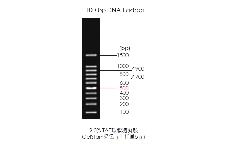 100bp DNA Ladder是由11條線狀雙鏈DNA條帶組成,適用于瓊脂糖凝膠電泳中DNA條帶的分析,不建議用于聚丙烯酰胺凝膠電泳。本產(chǎn)品為即用型產(chǎn)品,已含有1×Loading Buffer,可根據(jù)實驗需要,直接取5 μl電泳,使用方便,電泳圖像清晰。其中500 bp條帶濃度為100 ng/5 μl,顯示亮帶,其余條帶濃度均為50 ng/5 μl。便于準確判斷目的產(chǎn)物DNA的量。