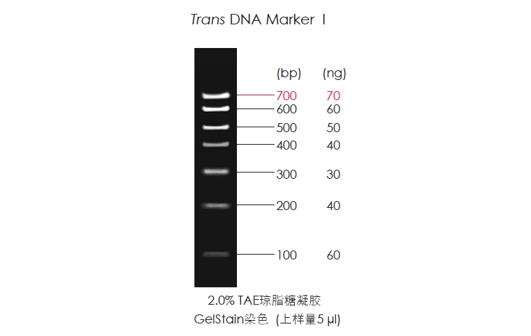 Trans DNA Maker I是由7條線狀雙鏈DNA條帶組成,適用于瓊脂糖凝膠電泳中DNA條帶的分析,不建議用于聚丙烯酰胺凝膠電泳。本產(chǎn)品為即用型產(chǎn)品,已含有1×Loading Buffer,可根據(jù)實驗需要,直接取5 μl電泳,使用方便,電泳圖像清晰。便于準(zhǔn)確判斷目的產(chǎn)物DNA的量。