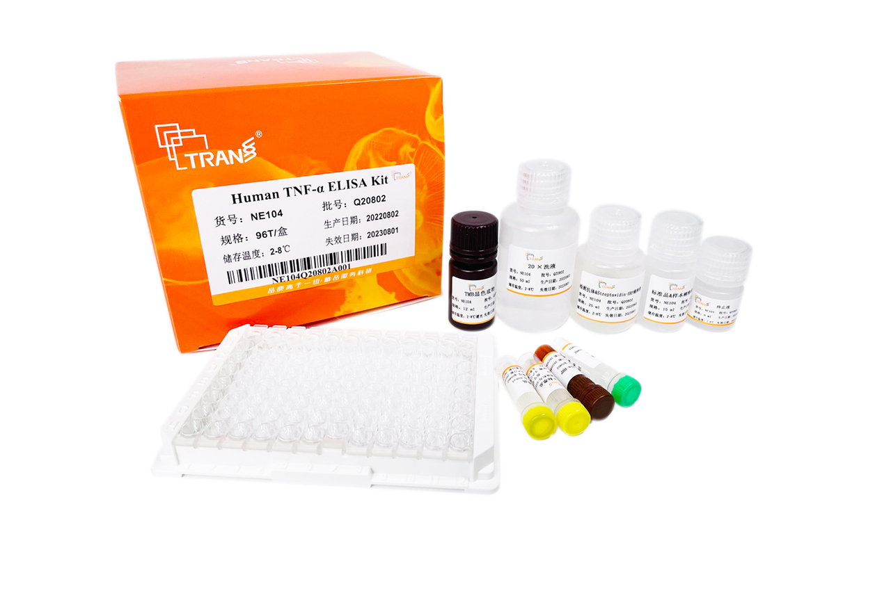 本試劑盒采用雙抗體夾心ELISA法定量測(cè)定人血清、血漿和細(xì)胞培養(yǎng)上清中的TNF-α含量。本試劑盒采用高親和力的抗人TNF-α抗體預(yù)包被酶標(biāo)板,將標(biāo)準(zhǔn)品/待測(cè)樣本加入微板孔中,經(jīng)過(guò)孵育后樣本中存在的TNF-α?xí)c酶標(biāo)板上的預(yù)包被抗體特異性結(jié)合。洗滌去除未結(jié)合物后,將生物素標(biāo)記的抗人TNF-α檢測(cè)抗體加入微板孔中,再次孵育后檢測(cè)抗體會(huì)與錨定在酶標(biāo)板上的TNF-α特異性結(jié)合。隨后,將辣根過(guò)氧化物酶標(biāo)記的鏈霉親和素(Streptavidin-HRP)加至微孔板中并孵育,通過(guò)檢測(cè)抗體上的生物素和鏈霉親和素發(fā)生的高強(qiáng)度非共價(jià)結(jié)合,形成“包被抗體-人TNF-α蛋白-檢測(cè)抗體-Streptavidin-HRP”免疫復(fù)合物。再次洗滌后,將顯色底物TMB加至微板孔中,HRP會(huì)催化TMB底物生成藍(lán)色產(chǎn)物,顏色反應(yīng)的深淺將與樣本中TNF-α的濃度成正相關(guān)。而后加入終止液終止反應(yīng),在450 nm波長(zhǎng)(參考波長(zhǎng)570 - 630 nm)處測(cè)定吸光度值。通過(guò)繪制標(biāo)準(zhǔn)曲線,由樣本吸光度值可計(jì)算出樣本中所含TNF-α濃度。本試劑盒特異性強(qiáng)、檢測(cè)靈敏度高,同時(shí)操作更加便捷。