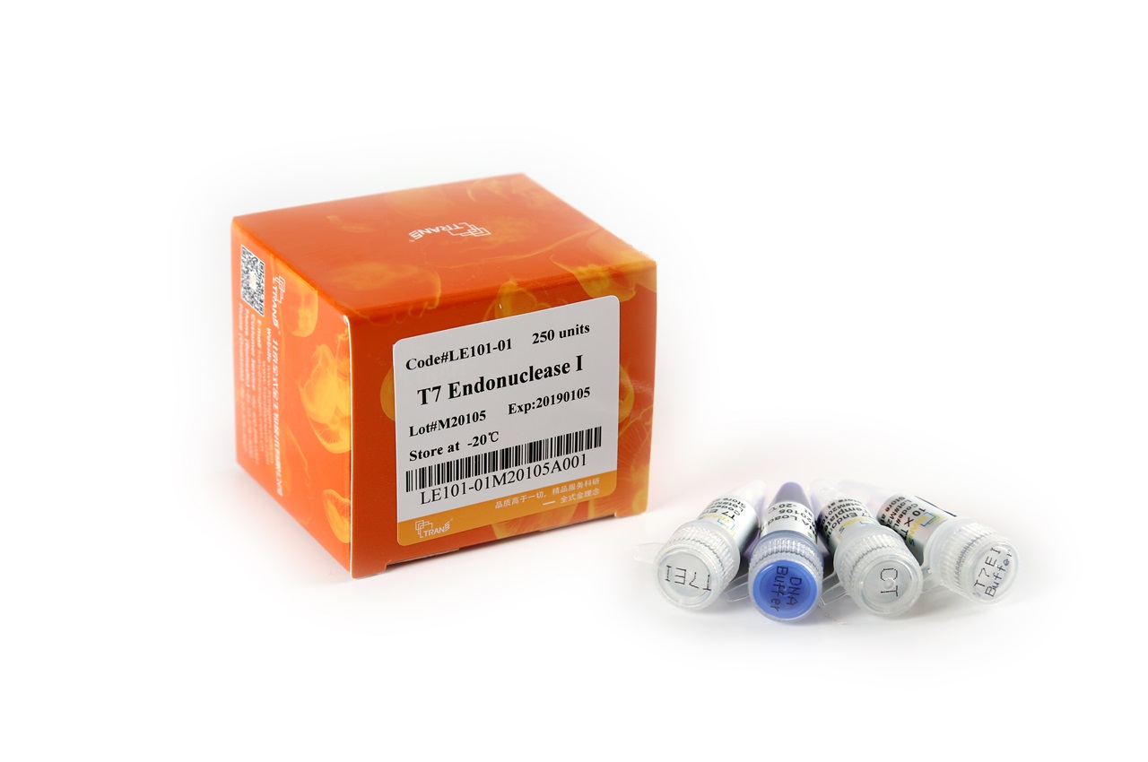 本產(chǎn)品由重組T7 Endonuclease I(T7EI)基因的載體,在大腸桿菌中經(jīng)誘導(dǎo)表達(dá)、純化而成。T7EI識別并切割不完全配對、含十字形結(jié)構(gòu)、Holliday結(jié)構(gòu)、異源雙鏈的DNA以及隨機(jī)切割單鏈DNA。該酶切割位點(diǎn)在錯配堿基5'端的第一、第二或第三個磷酸二酯鍵。