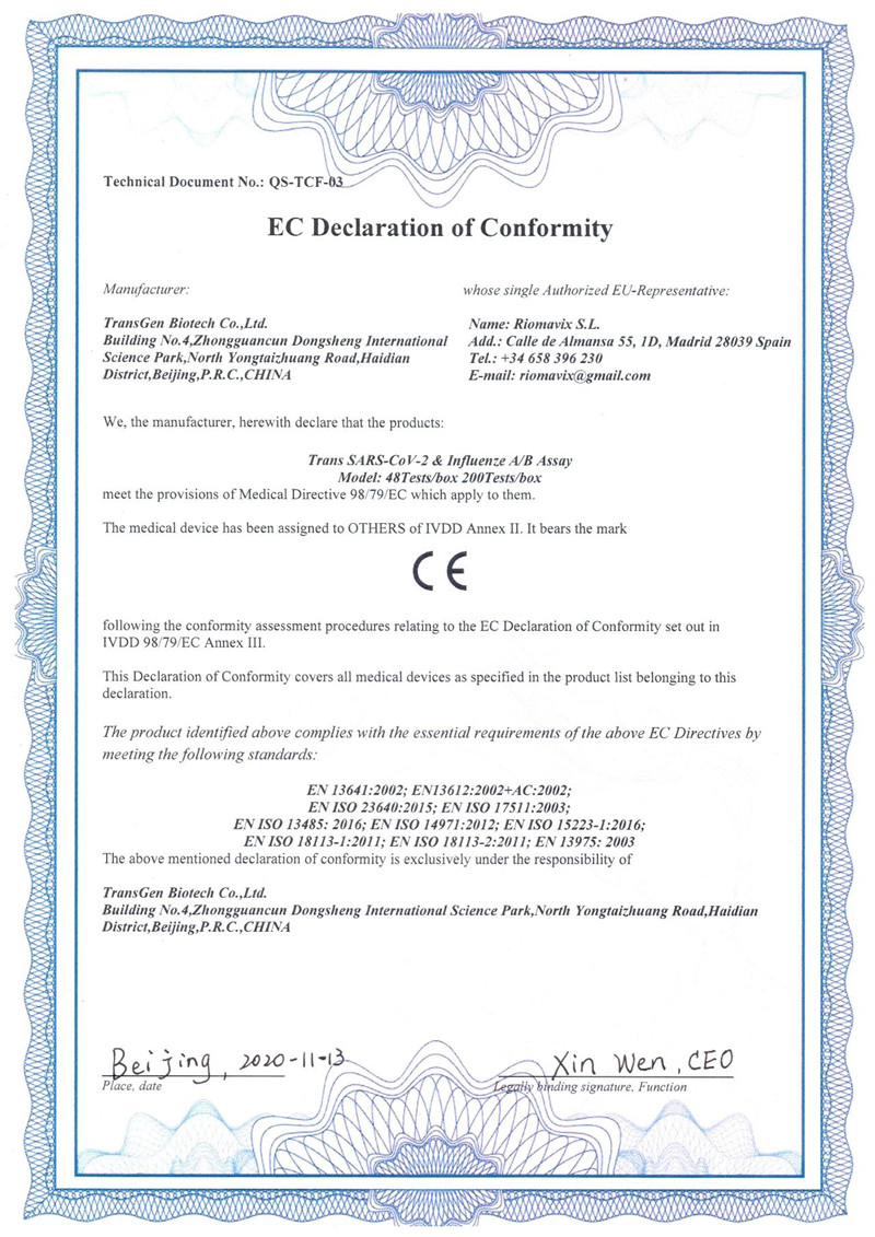 近日,全式金自主研發(fā)的新冠/甲乙流聯(lián)檢試劑盒(Trans SARS-CoV-2 & Influenze A/B Assay)完成歐盟CE認證,標志著我司產(chǎn)品符合歐盟相關(guān)指令的要求,已完成歐盟主管當局登記注冊,具備歐盟市場的準入條件。這是全式金在新型冠狀病毒(2019-nCoV)核酸檢測試劑盒取得CE認證后再次取得的突破。