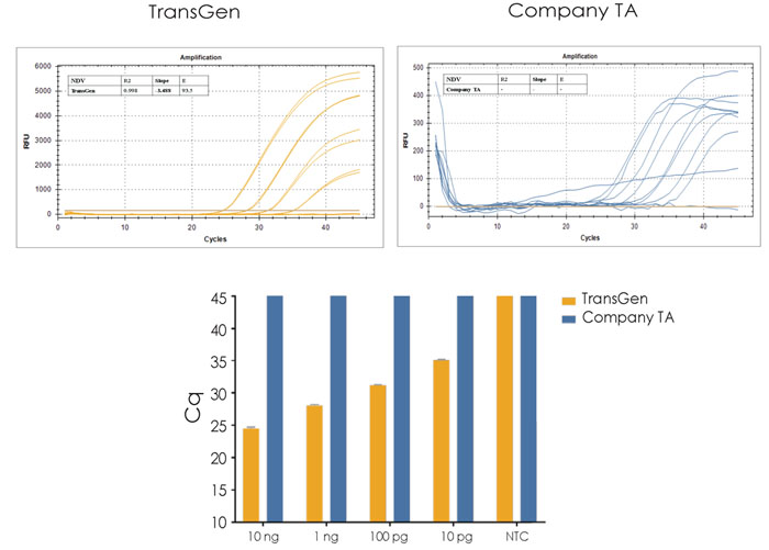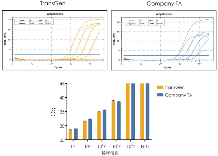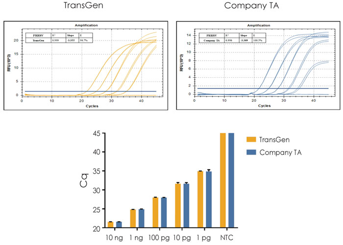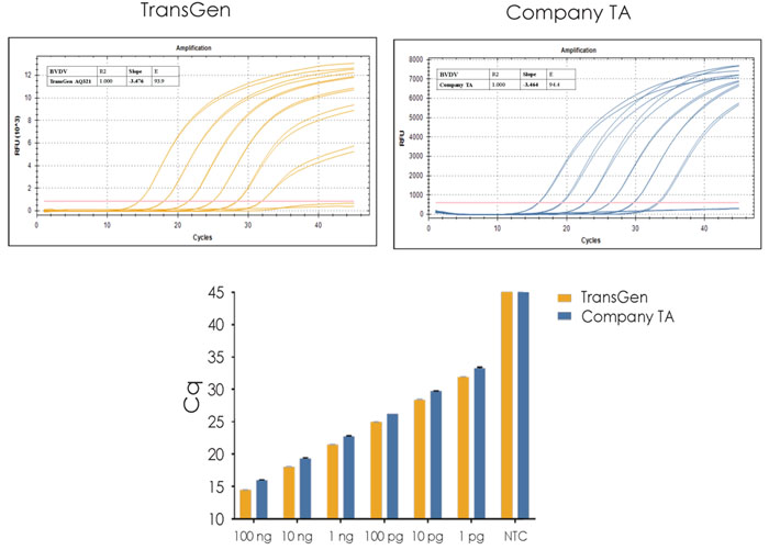 使用TransGen 和Company TA 熒光定量產(chǎn)品進(jìn)行擴(kuò)增,結(jié)果顯示TransGen 產(chǎn)品與Company TA 擴(kuò)增效果相當(dāng)