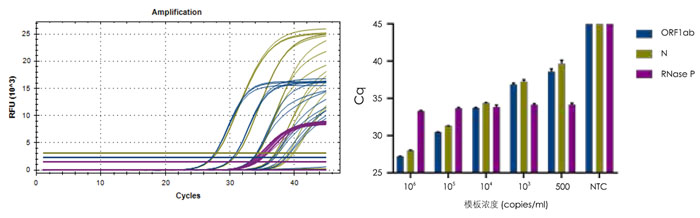 使用TransGen 多重?zé)晒舛慨a(chǎn)品擴(kuò)增新冠病毒基因(ORF1ab、N) 和人源內(nèi)標(biāo)基因(RNase P),結(jié)果顯示,TransGen 產(chǎn)品可進(jìn)行多重?cái)U(kuò)增,靈敏度可達(dá)500 copies/ml