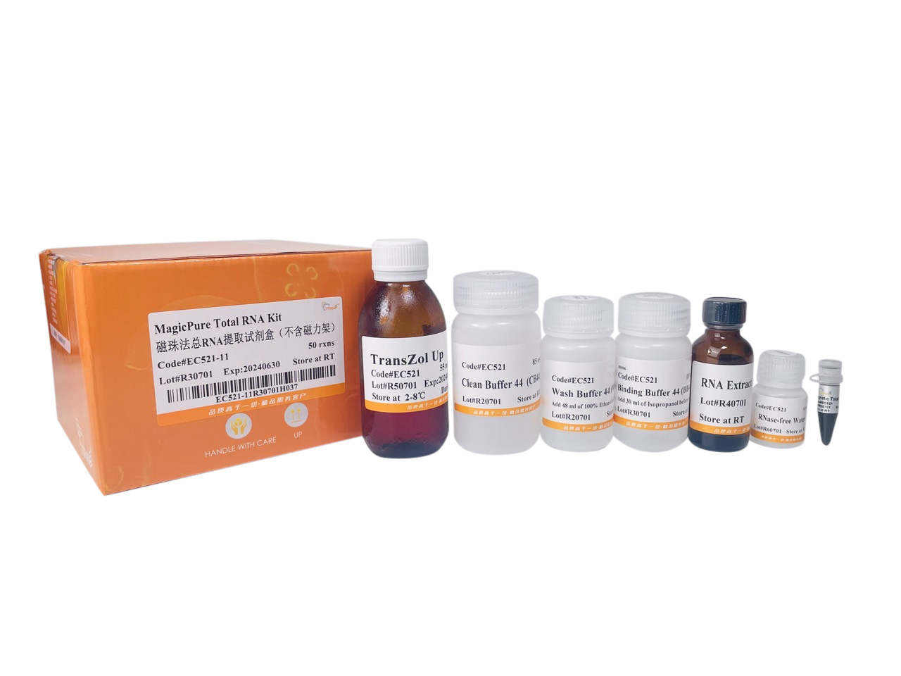 本試劑盒廣泛適用于培養(yǎng)細(xì)胞、微生物和動(dòng)植物組織等樣本的總RNA提取。 用TransZol Up充分裂解樣品,加入RNA Extraction Agent后,溶液分為無(wú)色上層(水相)、中間層和粉紅色下層(有機(jī)相), RNA溶解在水相中。收集水相溶液后,經(jīng)磁珠特異吸附便可回收其中的RNA。與其它總RNA提取方法相比,具有裂解能力強(qiáng)、提取量高,應(yīng)用范圍廣等優(yōu)點(diǎn)。本試劑盒適用于磁棒式高通量核酸提取儀。