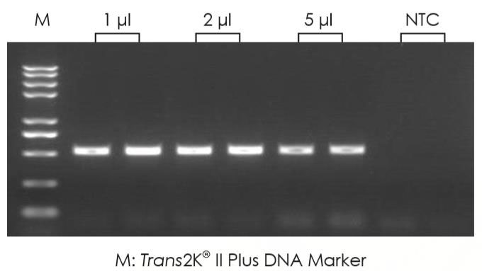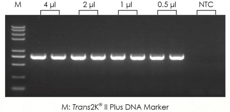 研發(fā)小伙伴以不同濃度的 Hela 細胞來源的Total RNA 進行反轉(zhuǎn)錄后獲得的 cDNA 為模板,使用 FastPfu 酶進行 PCR 擴增。
