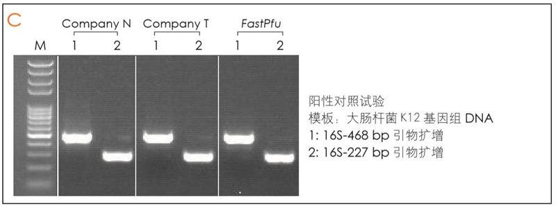 研發(fā)的小伙伴設(shè)計大腸桿菌擴增引物 16S-227bp (圖 A) 與 16S-468 bp (圖 B),分別使用 Comany T、 Company N 與 FastPfu 酶,以水和大腸桿菌K12 基因組DNA( 圖 C, 陽性對照試驗 ) 為模板進行不同循環(huán)數(shù)擴增,檢測大腸桿菌基因組DNA殘留。