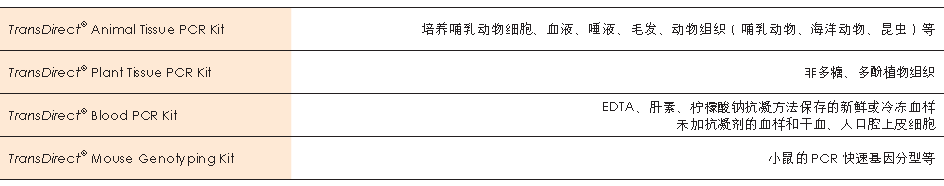 本試劑盒采用獨(dú)特的裂解緩沖液裂解組織 (新鮮、凍存組織),所得裂解物無需純化即可作為模板,用抗抑制的2×TransDirect? PCR SuperMix Ⅱ (+dye)進(jìn)行擴(kuò)增。擴(kuò)增產(chǎn)物可直接上樣電泳。AD3 Buffer建議分裝使用。