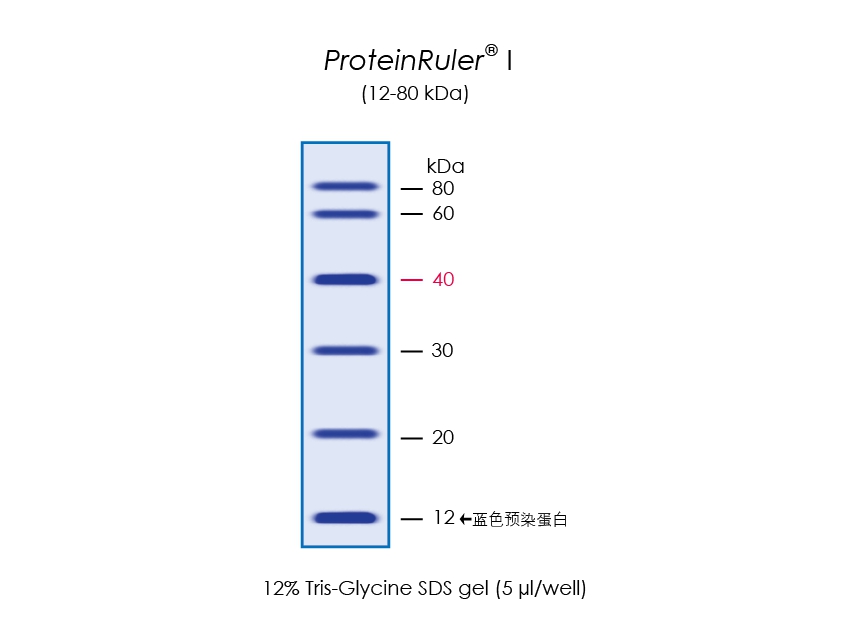 ProteinRuler? I由6種重組蛋白質(zhì)組成,分子量范圍為12 kDa-80 kDa。經(jīng)SDS-PAGE電泳后,用考馬斯亮藍(lán)染色可見清晰的6條帶。12 kDa為藍(lán)色預(yù)染蛋白,便于動態(tài)觀察蛋白質(zhì)電泳狀態(tài)。40 kDa為加亮條帶,便于分子量鑒定。